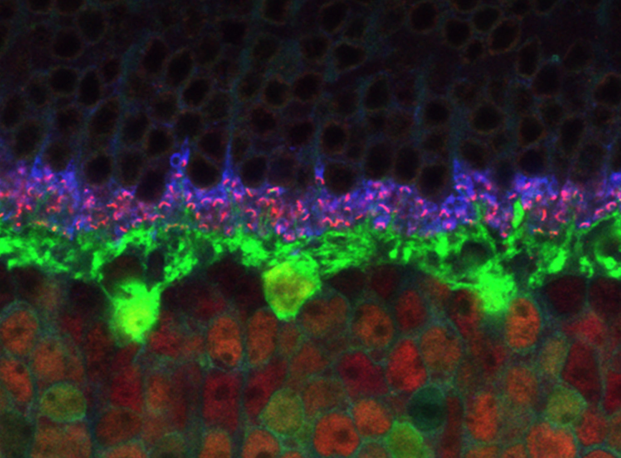 Horizontal cells are the laterally interconnecting neurons in the outer plexiform layer of the retina of mammalian eyes. They help integrate and regulate the input from multiple photoreceptor cells. Among their functions, horizontal cells are responsible for allowing eyes to adjust to see well under both bright and dim light conditions.
